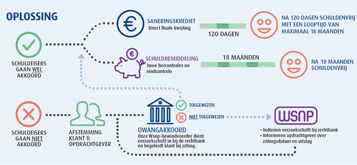 Schulden kunnen ook opgelost worden door tussenkomst van een rechter. Dit traject heet WSNP (Wet Schuldsanering Natuurlijke Personen), een traject waarbij een rechter beslist of iemand wordt toegelaten en er een schuldenbewindvoerder wordt toegewezen. Voorafgaand aan een WSNP-traject dient onderzocht te worden of een minnelijk traject mogelijk is.